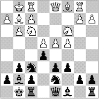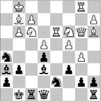 Now black launches into attractive series of sacs which probably entranced him. Simpler moves must give him more, and probably there’s a direct win. Now it simplifies to a slight plus for white